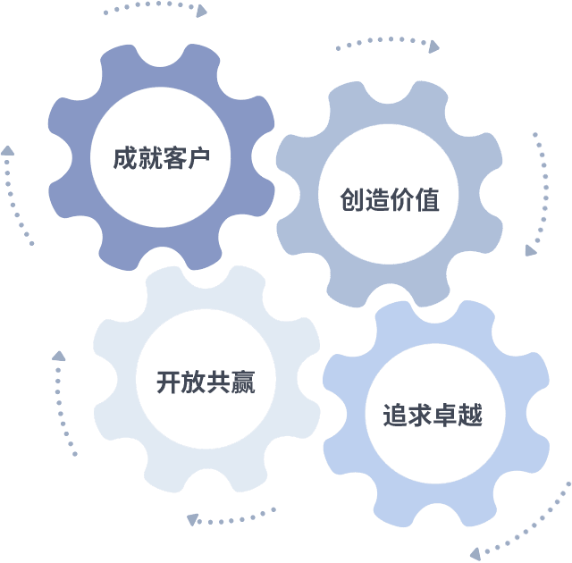 成就客户是一切决策的出发点,,创造价值是衡量所有工作的标准,,,追求卓越是我们做事做人的态度,,,,开放共赢是我们的格局也是最终的结果。。。。价值观的齿轮环环相扣,,,,推动着组织里的每个人不断向前。。