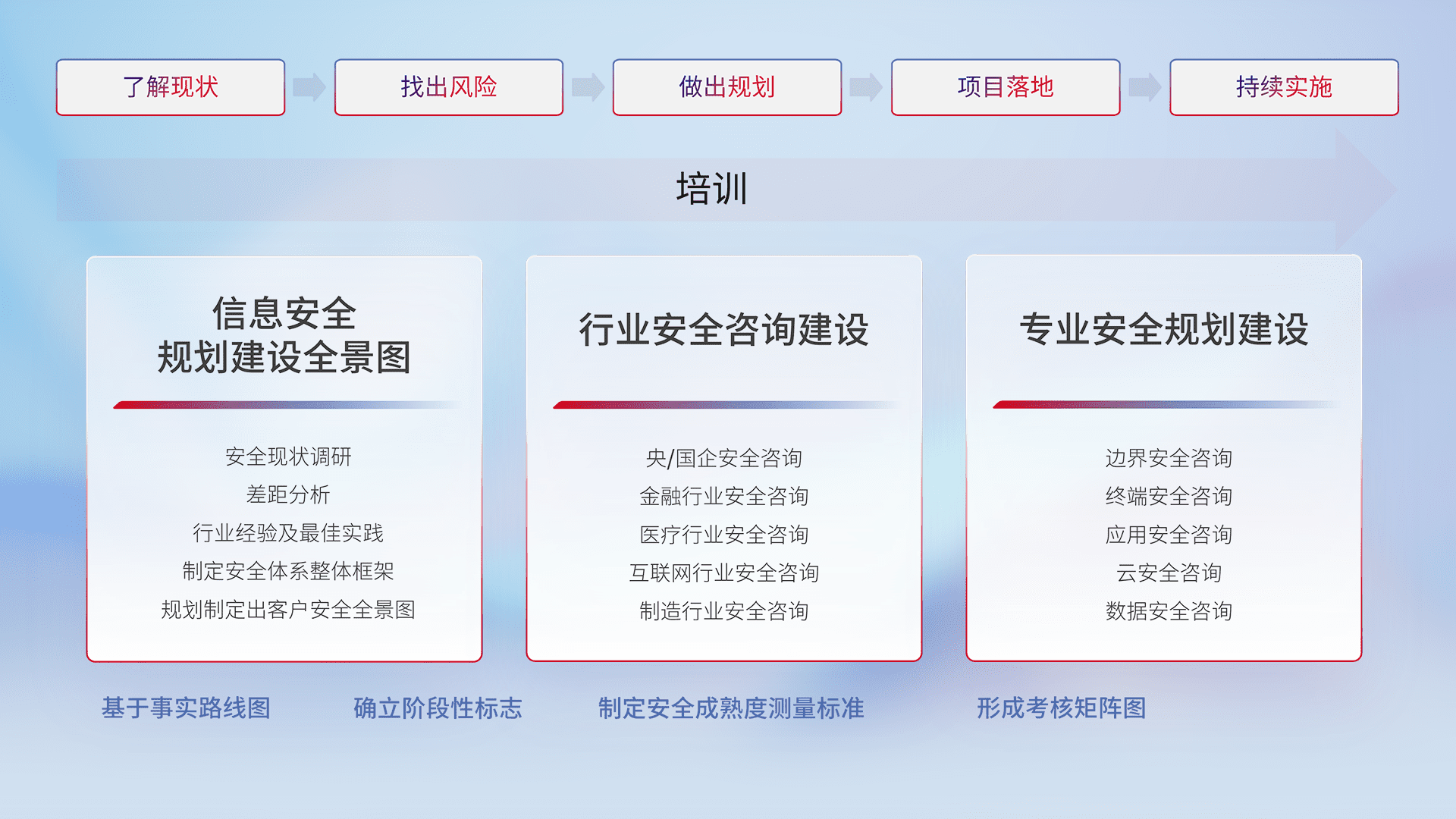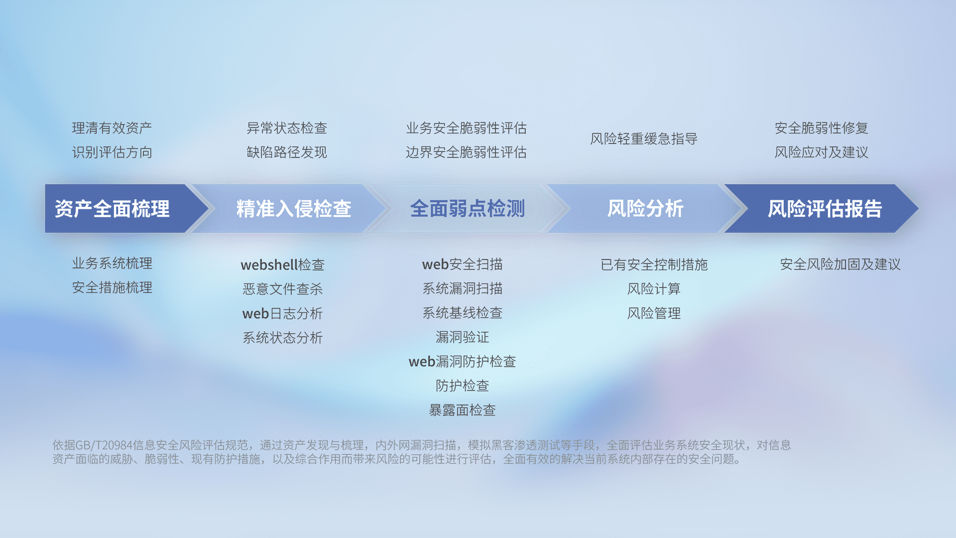 针对客户行业特性,,以专业的安全服务+多厂商联合解决方案提供专属的一站式安全管理服务,,,,帮助客户全面感知网络空间威胁,,基于识别、、、、检测、、、分析、、、、防护、、监测、、、、响应的服务理论模型,,,,从方案咨询、、、、集成交付、、评估验证、、优化加固、、、、运维运营,,致力于为客户提供完整的闭环管理式安全服务。。以实战经验为客户打造高抵御风险的安全体系,,,,帮助客户发现威胁、、、对抗威胁、、、处置威胁,,,不断积累安全对抗能力,,,,持续保障数字化安全。。。